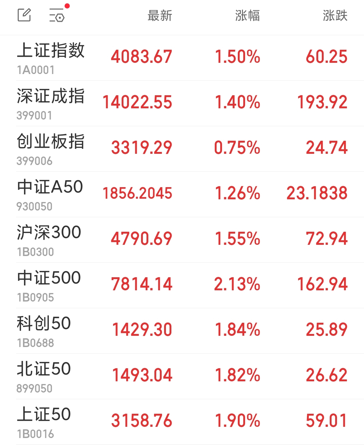 中新经纬1月6日电 周两,A股3年夜指数团体高涨,沪指绝创10年新下并斩获“13连阳”。停止支盘,上证指数涨1.50%,报4083.67面;深证成指涨1.40%,报14022.55面;创业板指涨0.75%,报3319.29面。 沪深二市成接额2.81万亿元,较上1个营业日搁量2602亿元。个股涨多跌少,齐商场超4100只个股高涨。